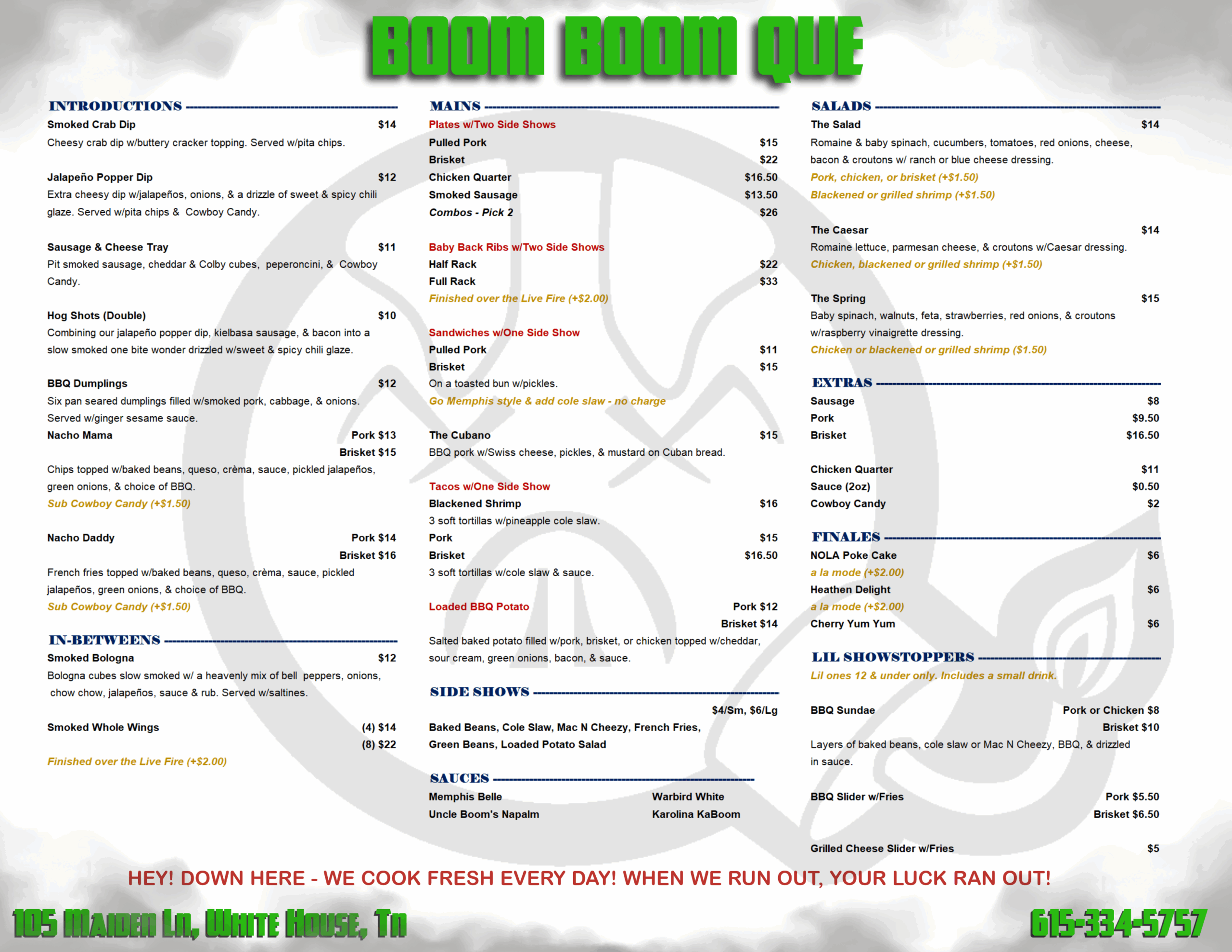 At Boom Boom Que, our menu is built on fire, flavor, and fierce competition. These are the dishes that earned their stripes on the professional barbecue circuit—slow-smoked meats, crave-worthy sides, and house-made sauces that bring it all together. Whether you’re a baby back loyalist or pulled pork purist, there’s something here worth sinking your teeth into.