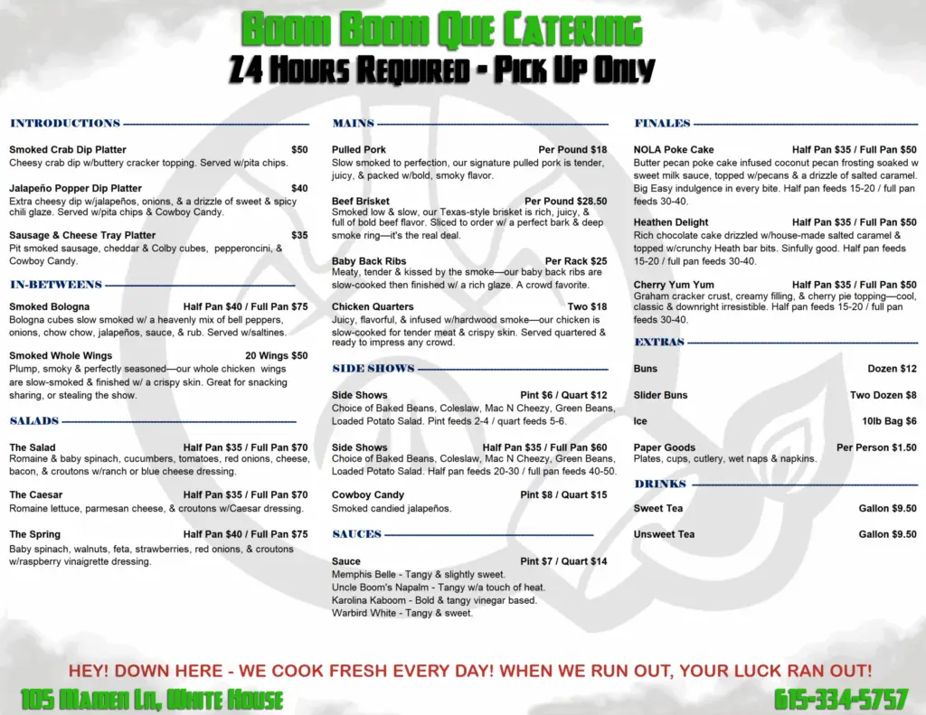 Make your next family gathering or special event effortless—and unforgettable—with Boom Boom Que catering for pickup. Our competition-tested barbecue is smoked low and slow, then packed up hot and ready to serve your crowd.