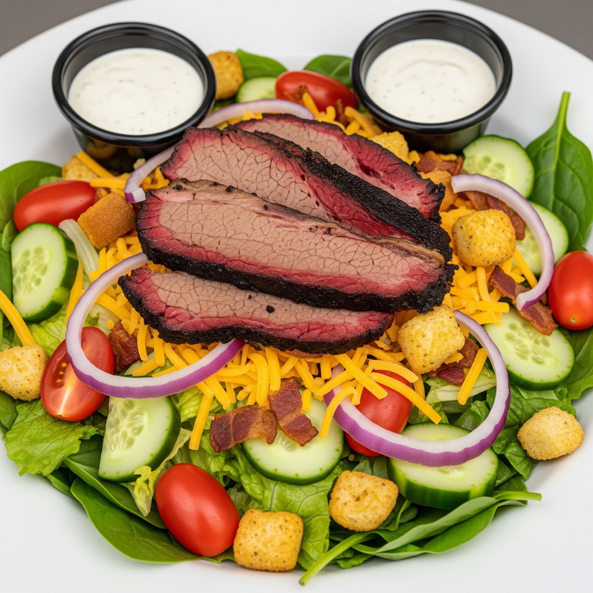 Romaine and baby spinach, cucumbers, tomatoes, cheese, green onions, BACON and croutons. Choose – Pork, Brisket, Chicken, Blackened or Grilled Shrimp