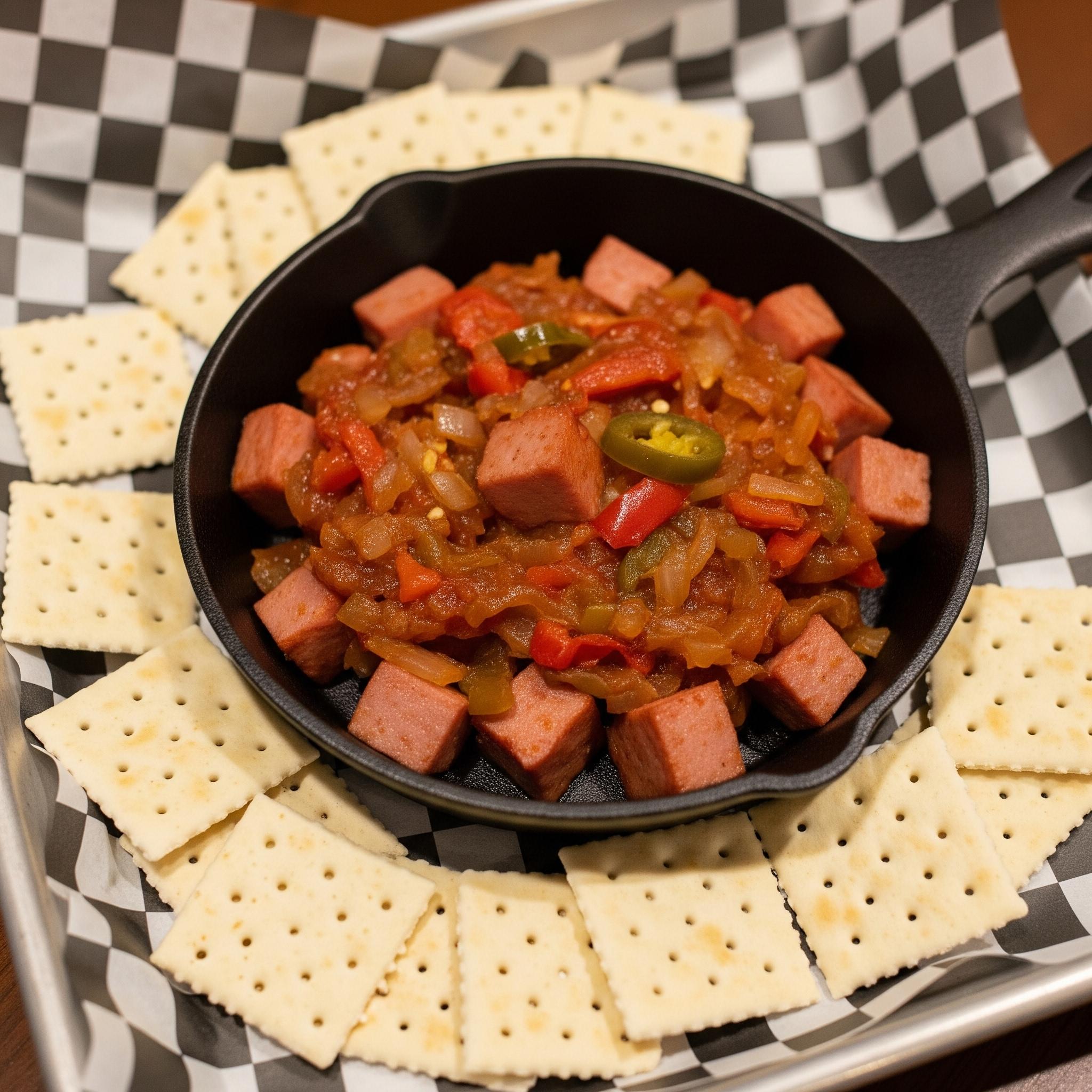 Bologna cubes slow smoked w/ a heavenly mix of bell peppers, onions, chow chow, jalapeños, sauce and rub. Served with saltines.