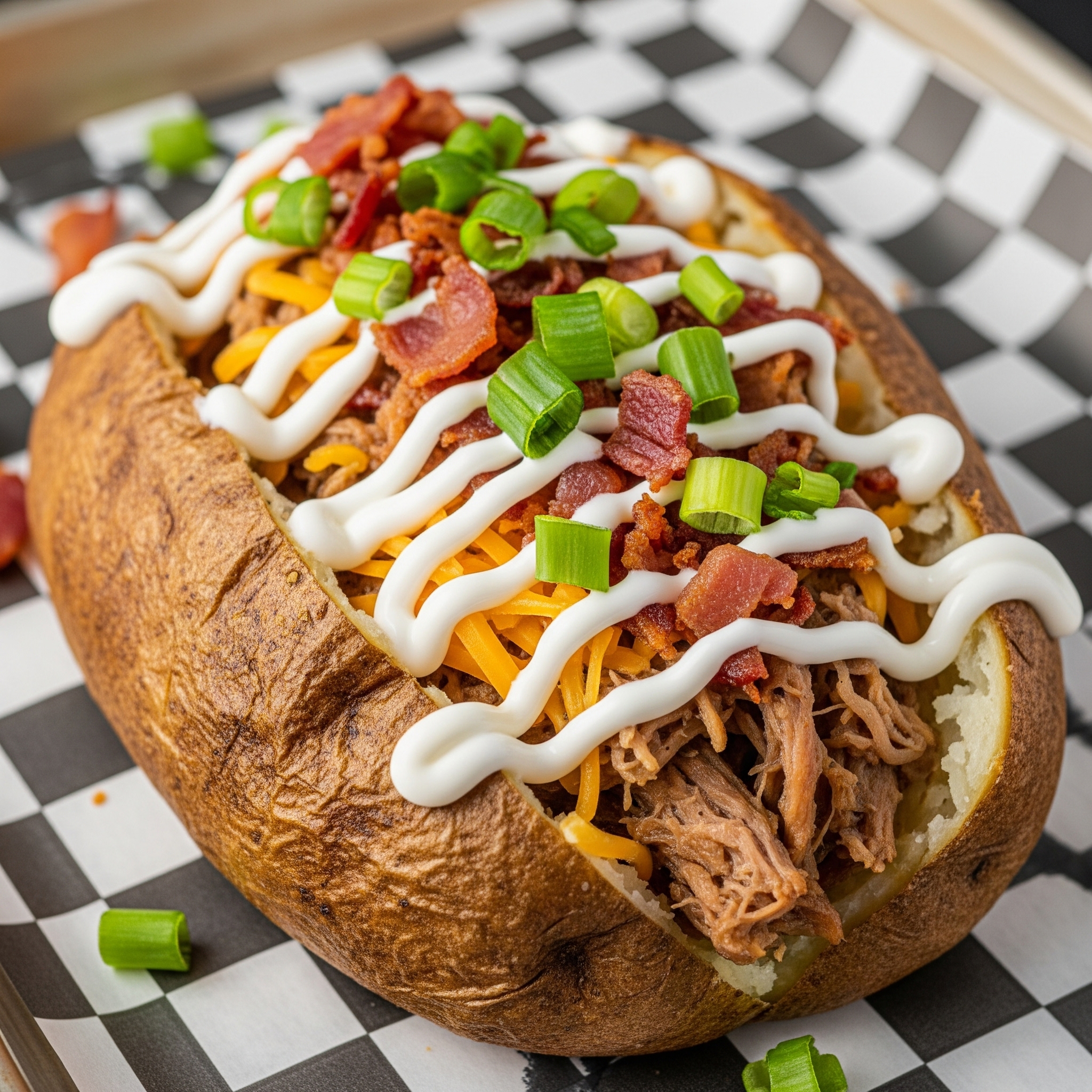 Salted baked potato filled with Pork or Chopped Brisket and topped with cheddar, sour