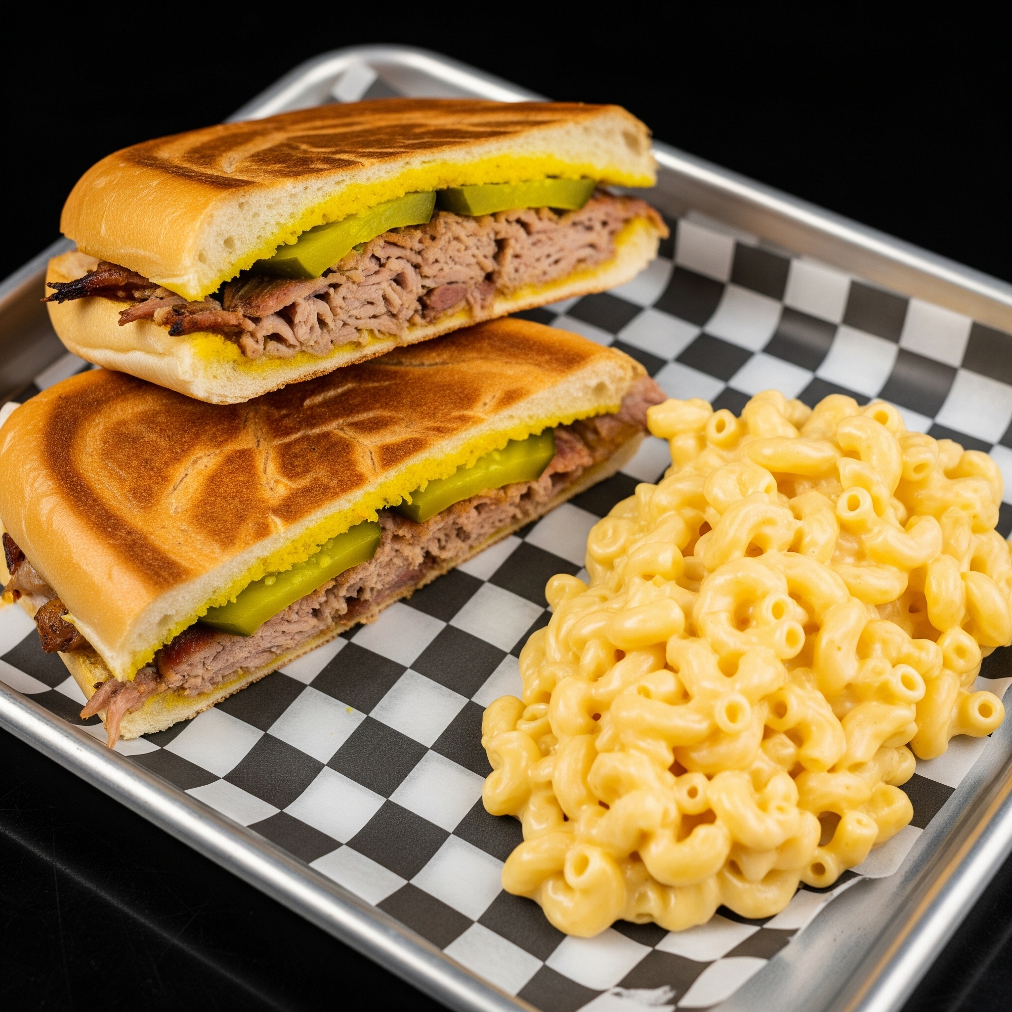 BBQ pork w/Swiss, bread n butter pickles, mustard on pressed Cuban bread